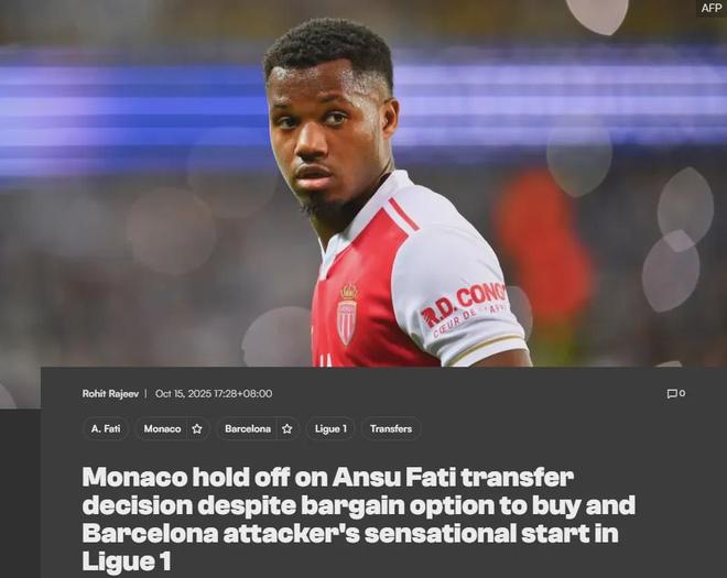 现年22岁的法蒂从巴萨租借加盟摩纳哥后,在出战的251分钟比赛里打进了6球,平均42分钟就能打进1球,这名新星也成为了1948年以来法甲赛场上打进5球所用时间最少的球员,报道称,摩纳哥有1100万欧元的选择性买断条款,但斯库罗坚称他们不急于做决定。
