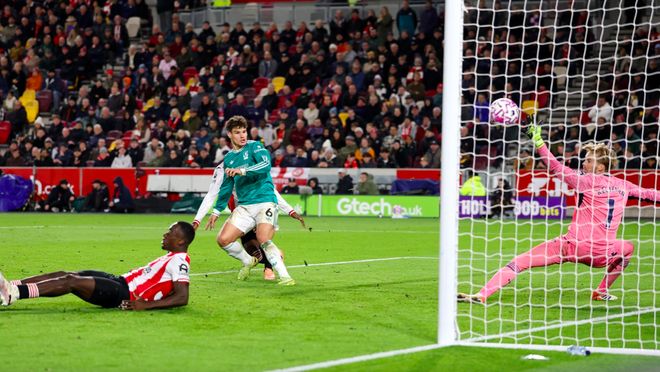 第53分钟,布伦特福德利用简单的配合就可以打穿利物浦的防守,接到沙德的传中,蒂亚戈的小角度射门被玛玛达什维利封住了角度。