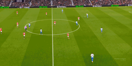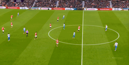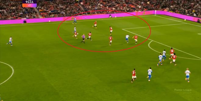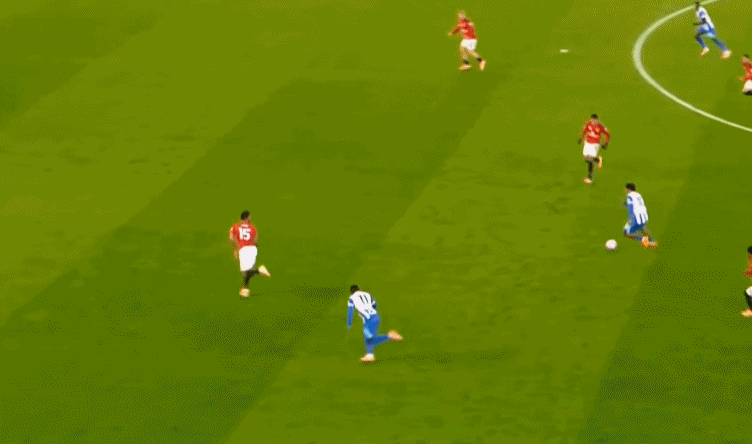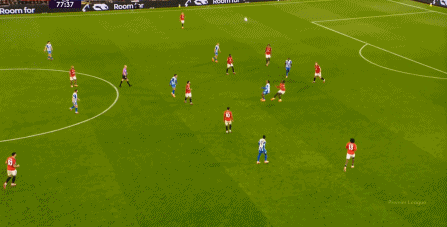 所以在开局阶段,在曼联还没有进球之前,布莱顿就已经可以通过曼联在某个局部的人盯人失败,从而获得非常好的机会:
